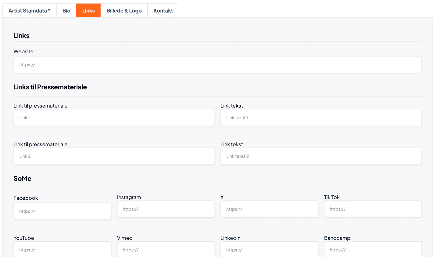 - Links: Indtast alle relevante hjemmesider & SoMe links til artistens kunstneriske virke.
